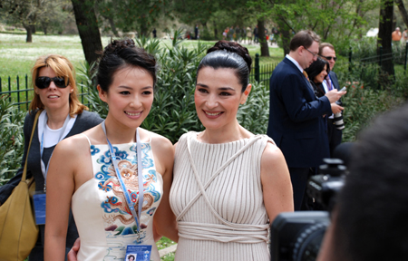 章子怡与最高女祭司接受黑龙江电视台新闻夜航采访