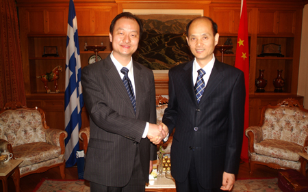 中国驻希腊大使罗林泉亲切会见世界华人协会主席胡荣强